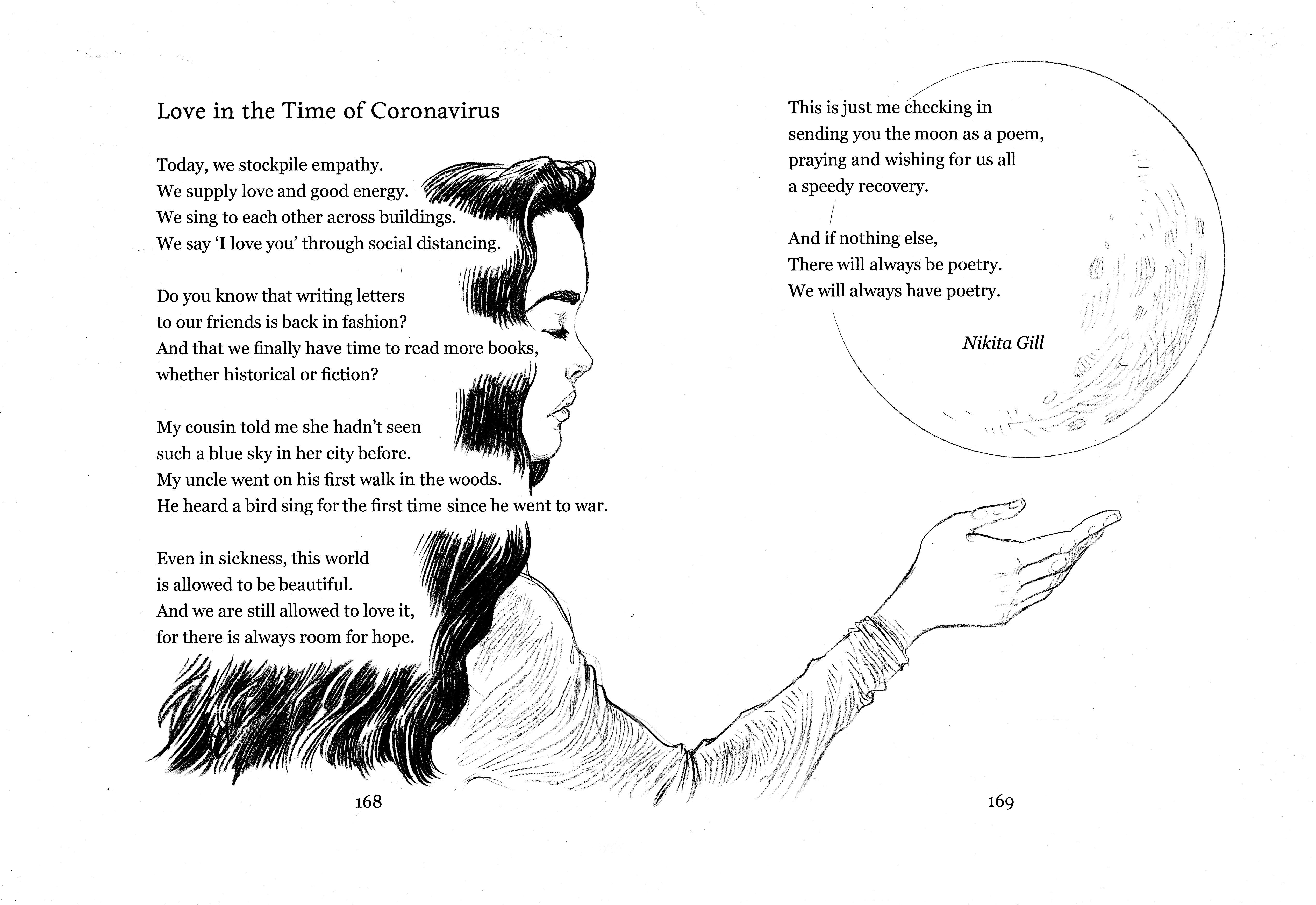 Love in the Time of Coronavirus, text (c) Nikita Gill 2020, illustration (c) Chris Riddell 2020. From Poems To Save The World With by Chris Riddell, Macmillan Children’s Books